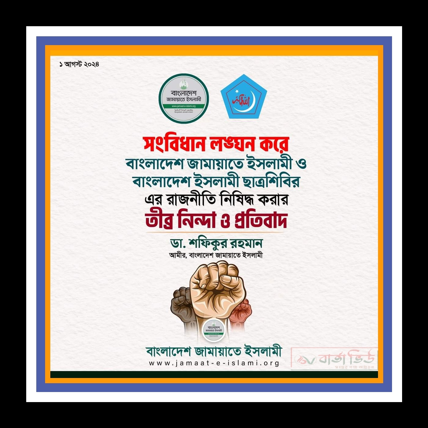 সংবিধান লঙ্ঘন করে সরকারের নির্বাহী আদেশবলে বাংলাদেশের প্রাচীনতম ঐতিহ্যবাহী গণতান্ত্রিক দল ‘বাংলাদেশ জামায়াতে ইসলামী’ ও ‘বাংলাদেশ ইসলামী ছাত্রশিবির’ এর রাজনীতি নিষিদ্ধ করার তীব্র নিন্দা ও প্রতিবাদ জানিয়ে বাংলাদেশ জামায়াতে ইসলামীর আমীর ডা. শফিকুর রহমান ০১ আগস্ট এক বিবৃতি প্রদান করেছেন।